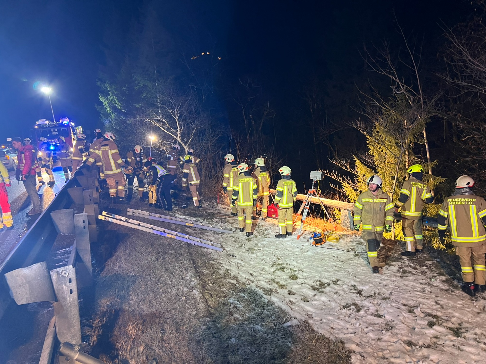 Am Freitag, dem 19.12.2025, um 17.24 Uhr, wurde die Freiwillige Feuerwehr Huben mittels Paiger zu einem Fahrzeugabsturz in der Nachbargemeinde Hopfgarten i.D. alarmiert. Ein österreichischer Staatsbürger kam aufgrund eines Sekundenschlafes von der Fahrbahn ab, schlitterte der Leitschiene entlang und stürzte anschließend über einen steilen Abhang ca. 35 Meter hinunter in die Schwarzach.